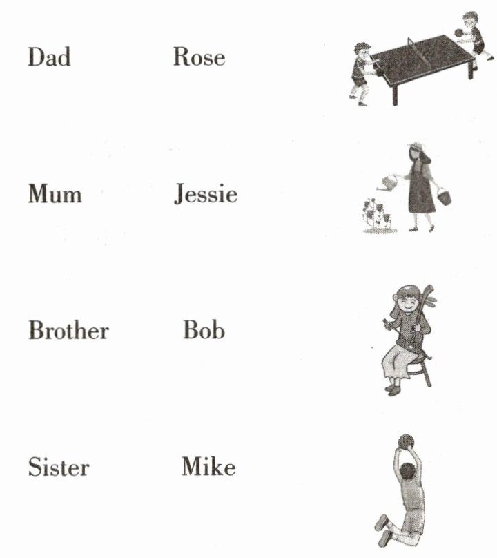 (一)将家庭成员与对应的姓名和兴趣爱好连线。