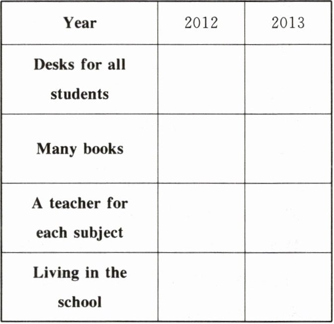 从2012年9月14日的日记“And there aren't desks and chairs for every student in this school. We don't have a lot of books. Sometimes,we don't even have a teacher!”可知,2012年没有为所有学生准备的课桌、很多书,也不是每个学科都有老师,且没有提到住校,所以2012年对应的“Desks for all students”“Many books”“A teacher for each subject”“Living in the school”都画“×”。