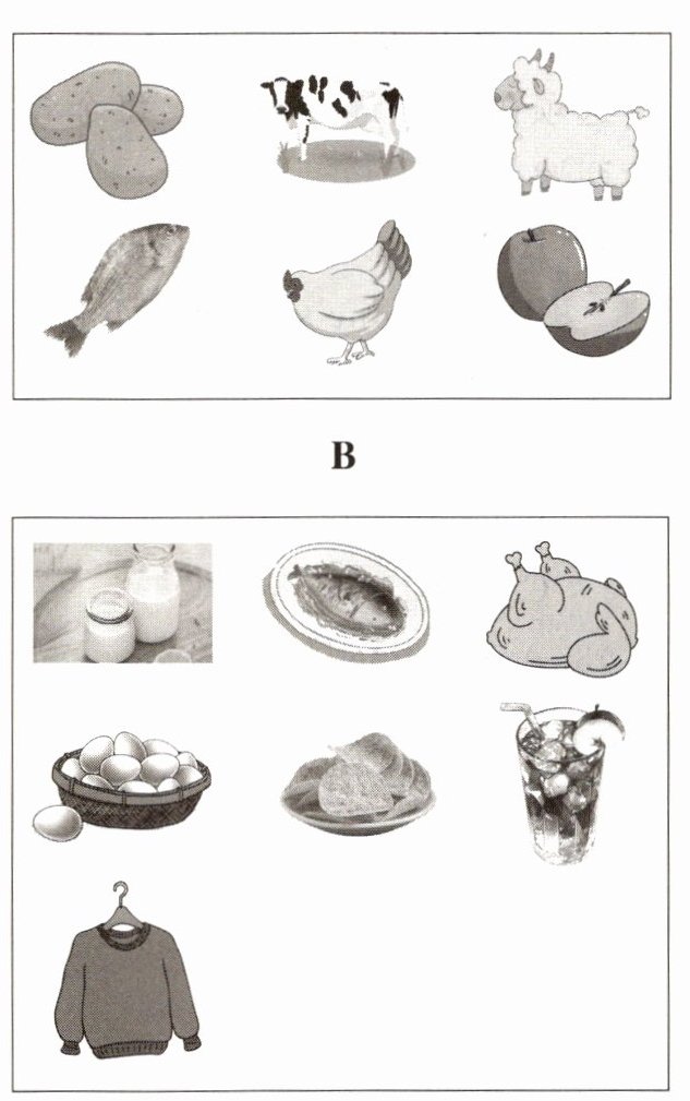 【解析】:本题主要考查了从动物或植物中获取不同产物的英语表达,需要根据图片内容以及示例,将A框中的动植物与B框中的事物进行对应,并补全句子。解题关键在于熟悉常见动植物及其相关产物的英语词汇,同时结合生活常识进行匹配。