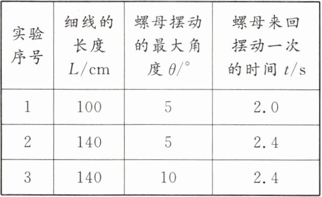 |实验序号|细线的长度L/cm|螺母摆动的最大角度θ/°|螺母来回摆动一次的时间t/s|