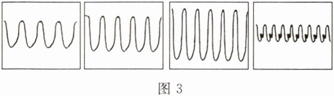 6. 编钟是我国出土的春秋战国时代的乐器,声音悦耳动听。现有四口编钟,如图2所示,其中一口编钟上有一隐蔽的裂痕,为了查找出这口编钟,用锤子分别敲击它们,将所产生的声波输入示波器中,图3中的四幅图为示波器中显示的波形,则敲