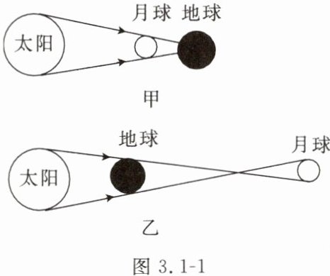2024年4月8日,在加拿大尼亚加拉大瀑布及其附近地区可观测到日全食,日全食的形成是由于光沿直线传播,此现象可以用图3.1 - 1中的图甲(选填“甲”或“乙”)来解释。