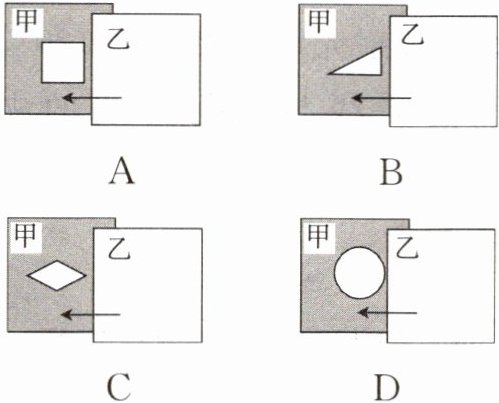 12. 在探究树荫下的光斑的综合实践活动中,小华用卡片乙覆盖在开有小孔的卡片甲上,并沿箭头方向水平移动卡片乙,一边改变小孔的形状和大小,一边观察光斑形状的变化情况。为了只研究孔的大小对光斑形状的影响,下列设计符合要求的是(