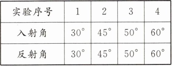 (选填“入射”或“反射”)角。在纸板上用笔描出入射光和反射光的径迹,多次改变入射光的角度,换用不同颜色的笔记录每次光的径迹,并测量入射角和反射角的大小,将实验数据记入下表。|实验序号|1|2|3|4|