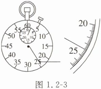2. 清晨,王爷爷绕小区花园步行锻炼身体,借助手中的秒表测量了自己步行一圈的时间为2min24s,如图1.2 - 3所示,秒表外圈示数的单位为