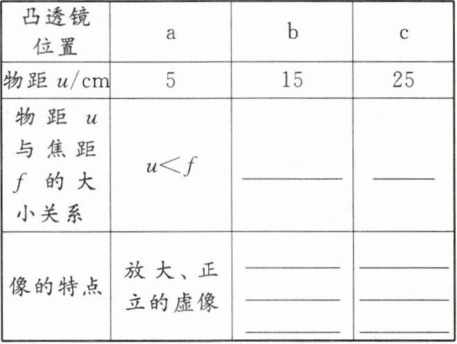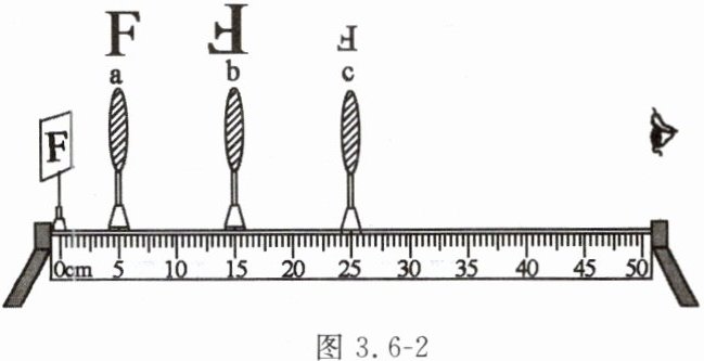 3. 如图3.6-2所示,把带有“F”字样的纸板放在光具座的零刻度线上,让凸透镜逐步远离纸板,用眼睛透过透镜观察纸板上的“F”。当透镜分别在a、b、c三个位置时,眼睛看到的像如其位置上方所示,各位置的物距(即字母“F”到凸透镜的距离)已记录在下表中,已知凸透镜的焦距为10cm。