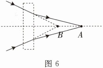 11. 如图6所示,一束光经过一个透镜后会聚于主光轴上的A点,取掉透镜后,光会聚于B点,则该透镜的种类及其对光线起的作用分别是(