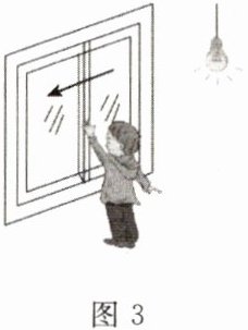 7. 如图 3 所示,晚上,小诗在客厅的窗户玻璃上看到了自己和客厅里的灯的像。小诗发现自己向窗户靠近时,她在玻璃中的像的大小