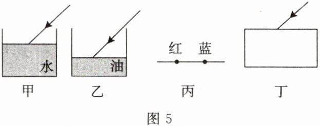 (4) 为了探究猜想3,小明利用图5甲装置继续实验,先后以相同方向向杯中液面同一位置射入红、蓝色激光,杯底光斑位置如图5丙所示,则光从空气斜射入水中时,