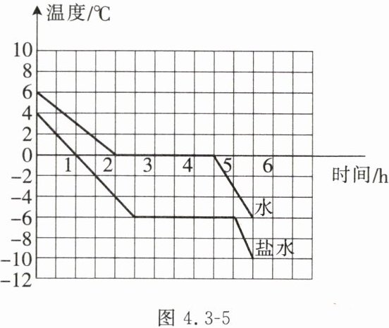 探究一:用冰和盐冰(用盐水制成的冰)制作冰盒,哪个制冷效果更好?他们利用电冰箱测量了水和盐水的凝固点,并根据实验数据绘制了水和盐水的凝固图像,如图4.3-5所示。