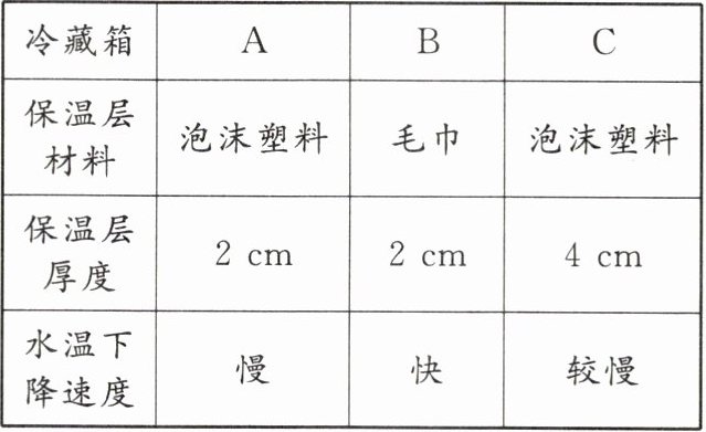 探究二:箱体选用哪种材料冷藏保温性能更好?于是他们取了三只等大的鞋盒,盒内侧分别放入不同厚度的泡沫塑料、毛巾,做好固定,制成简易冷藏箱A、B、C。在箱内分别放入等量50℃的热水,每2min打开一次箱盖,用温度计测量水温,记录现象及数据,如下表所示。