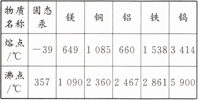 |物质名称|固态汞|镁|铜|铝|铁|钨|