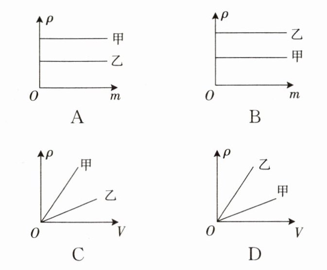 5. 如图 5.2 - 4 所示,两个完全相同的圆柱形玻璃容器中分别装有质量相等的两种液体,液体密度分别是 $\rho_{甲}$ 和 $\rho_{乙}$。下列关于这两种液体的图像正确的是(