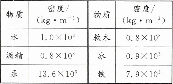 |酒精|$0.8×10^{3}$|冰|$0.9×10^{3}$|