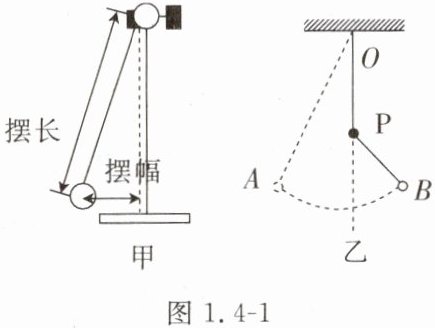 无关。(5) 如图 1.4 - 1 乙所示,在摆线悬挂点 O 的正下方固定一个铁钉 P,将摆球从 A 点释放,摆线碰到铁钉后摆球仍能继续摆动,到达 B 点后再摆回,如此往复。若摆长为 0.8 m,则单摆在 A、B 两点间来回摆动一次所需的时间应