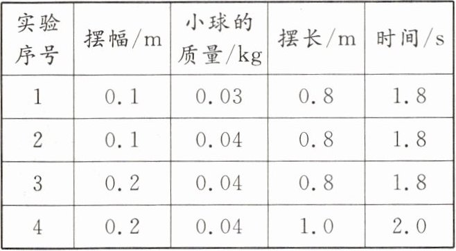 |实验序号|摆幅/m|小球的质量/kg|摆长/m|时间/s|