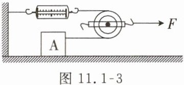 4. 如图11.1-3所示,重100N的物体A在力F的作用下,以2m/s的速度在水平面上匀速向右运动,此时弹簧测力计的示数为10N,则拉力F为