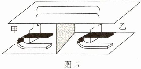 5. 科技活动中,小光所在的科技小组展示了一个“隔板推物”的节目,其原理如图5所示。甲、乙两线圈分别悬挂在两个蹄形磁铁的磁场中,两线圈通过导线连接构成一个闭合回路。用手推动甲线圈摆动时,乙线圈会随之摆动。对于这个过程,下列说法正确的是(