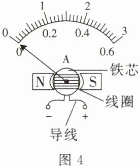 4. 图4为电流表的内部结构图,将电流表接入电路,有电流通过线圈,线圈转动会带动指针偏转,其工作原理与