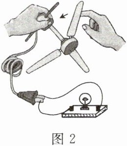 。如图2所示,拔下插头,在插头处接小灯泡,用手旋转叶片,小灯泡发光,这是电磁感应