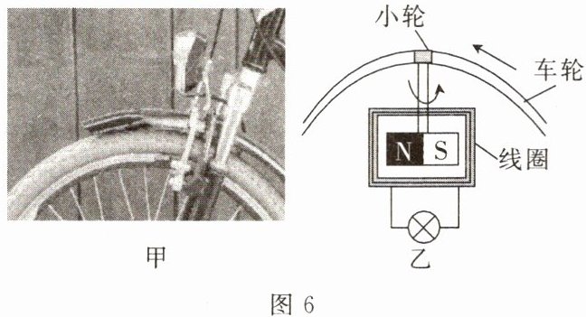 6. (多选)图6甲所示的是一种自行车上的装置,车前端的灯泡与该装置内部线圈相连,自行车车轮的转动带动该装置上端的小轮转动,小轮带动内部的磁铁转动,灯泡便发光,实现照明功能,图6乙是其结构示意图。下列分析正确的是(