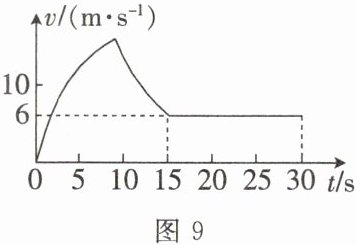 13. 跳伞是一项极具挑战的运动,现在越来越受到人们的喜爱。在某次跳伞训练过程中,一名重600 N的运动员从空中悬停的直升机上由静止开始竖直跳下,其速度与时间的关系如图9所示,经15 s下落210 m后,再匀速直线下落15 s。求: