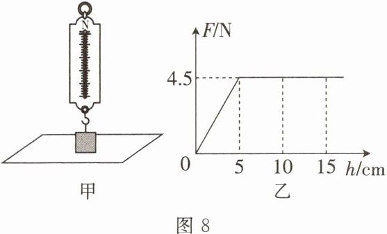 12. 如图8所示,用手提着已校零的弹簧测力计测量一个放在水平桌面上的物体所受的重力,从图8甲所示位置(此时弹簧测力计示数为0 N)开始,手匀速竖直向上移动,记下手移动的距离h和对应的弹簧测力计的示数F,并描出F-h图像,如图8乙所示。当h= 4 cm时桌面对物体的支持力是