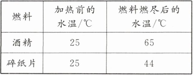 (4)从表格中记录的数据可以发现,相同质量的酒精和碎纸片充分燃烧后,放出热量更多的是