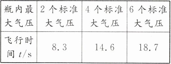 一定,改变水火箭起飞前的气压,多次实验,然后将实验数据整理记录在下表中。|瓶内最大气压|2个标准大气压|4个标准大气压|6个标准大气压|