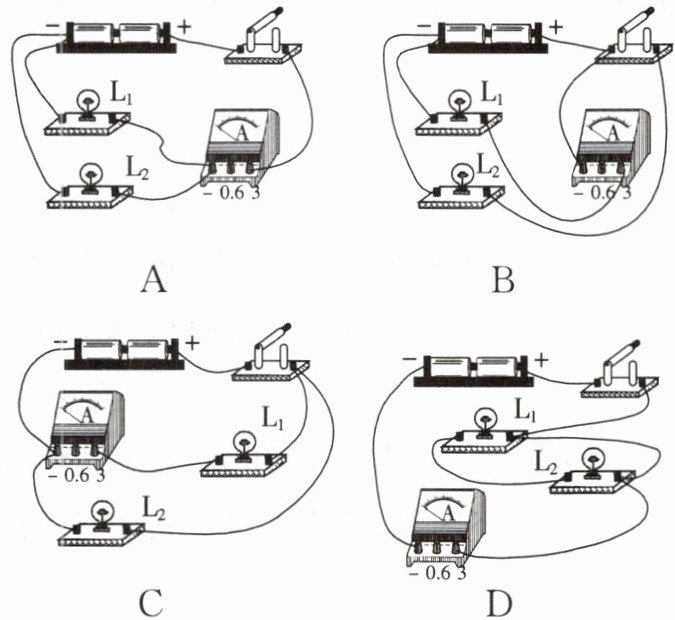 9. 以下电路中,可以正确测出通过灯$L_1$的电流大小的是(