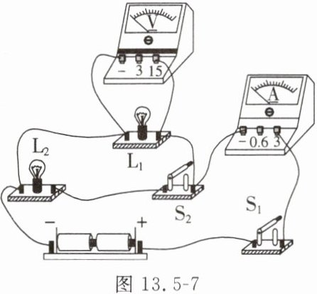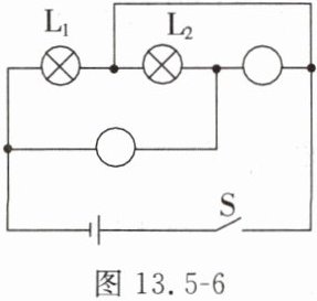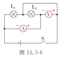 9. 在图13.5-6所示电路的“○”内填上适当的电表符号,并用“+”“-”在电表旁边标出正、负接线柱的位置。要求:当开关S闭合时,两灯泡均发光。