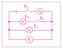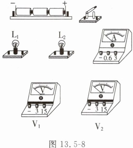 11. 在图13.5-8中根据要求完成作图:灯$L_1$、$L_2$串联,用电压表$V_1$测电路的总电压,用电压表$V_2测L_2$两端的电压,用电流表测电路中的总电流。在虚线框内根据实物图画出对应的电路图。