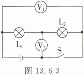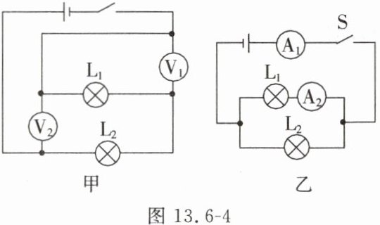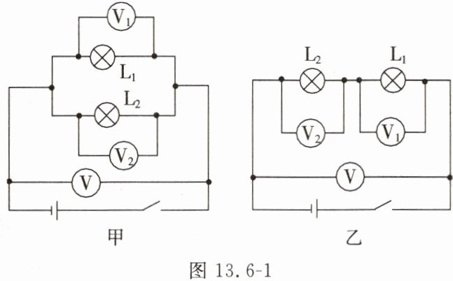 在如图13.6 - 1甲所示的电路中,闭合开关后电压表V₁的示数为4.5V,V₂的示数应为4.5V,V的示数应为4.5V。在图13.6 - 1乙所示的电路中,闭合开关后电压表V₁的示数为2.5V,V₂的示数为3.8V,V的示数应为6.3V。