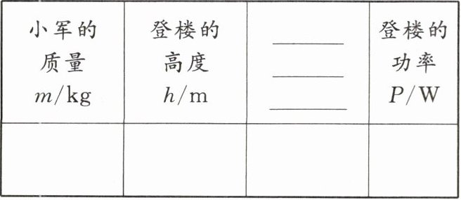 小军的质量$m/kg$ 登楼的高度$h/m$ 登楼所用时间$t/s$ 登楼的功率$P/W$