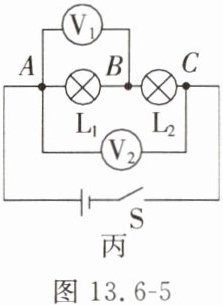 (3)具有创新精神的小雅决定改进实验。她按照图 13.6-5 丙所示电路图连接好电路,闭合开关,发现电压表$V_1$和$V_2$的指针偏转角度相同,则电压表