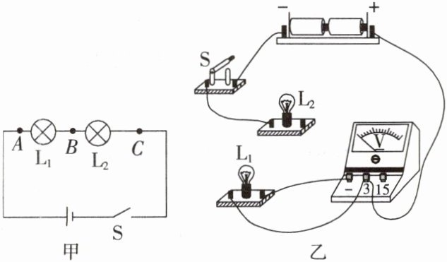 (1)他们按图 13.6-5 甲所示的电路图连接电路,用一只电压表分别测A、B,B、C,A、C间的电压。每次拆接电压表时,开关应处于