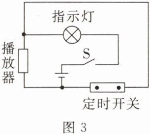 3. 图3是一种定时课间音乐播放装置的原理图:“播放器”是有电流通过时会播放音乐的装置;“定时开关”是到达设定时间,自动断开的开关。闭合开关S,当“定时开关”处于闭合状态时,指示灯