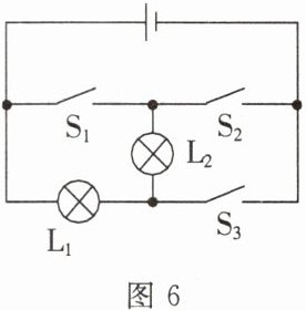 6. 在图6所示的电路中,若闭合$S_2,$断开$S_1、$$S_3$时,两灯