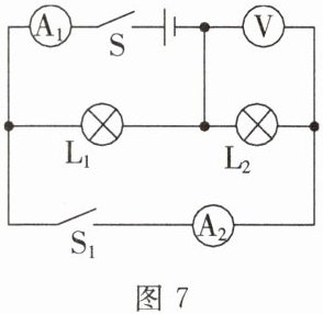(3)若图10丙中灯泡$L_1$的灯丝烧断,则电流表$A_1、$$A_2$的示数分别是多少?