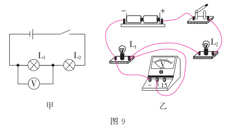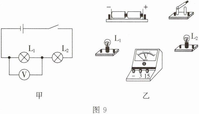 9. 请根据图9甲所示的电路,用笔画线代替导线,将图9乙中的实物连接起来(两灯泡规格相同)。