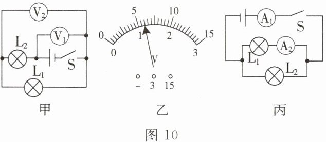 10. 如图10甲所示$,V_1$和$V_2$是两只相同的电压表。闭合开关后,灯泡$L_1、$$L_2$都发光,这时两只电压表的指针偏转角度相同,如图10乙所示。