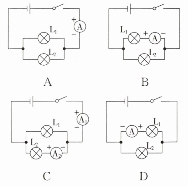 8. 下列电路图中,能正确测量通过灯$L_1$的电流的是(