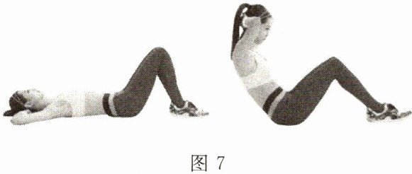 11. 如图7所示,质量为50 kg的小红同学在做仰卧起坐运动。假设她上半身的质量为全身质量的3/5,她在1 min内做了50个仰卧起坐,每次上半身重心上升的高度均为0.3 m。g取10 N/kg,求: