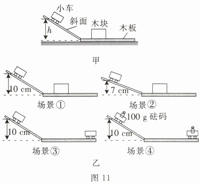 (2)如图11乙所示,比较场景①和②,可探究动能大小与