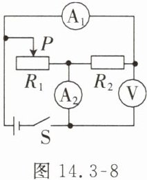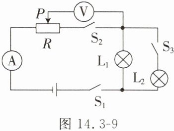 5. (多选)如图14.3-9所示,电源电压保持不变,闭合开关$S_{1}$、$S_{2}$,断开开关$S_{3}$,当滑片P向左滑动时(