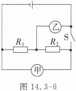 2. 如图14.3-6所示,当开关S闭合时,甲、乙两表均为电压表,两表示数之比为$4:3$,则$R_{1}$、$R_{2}$电阻之比为