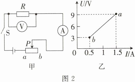 5. 如图2甲所示,电源电压不变,闭合开关后,将滑片P由b端滑到a端,电压表示数U与电流表示数I的变化关系如图2乙所示,则可判断电源电压是