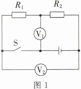 4. 如图1所示,电阻$R_{1}$为15 Ω,$R_{2}$为10 Ω。当开关S闭合后,电压表$V_{1}$的示数为3 V,则电源电压为