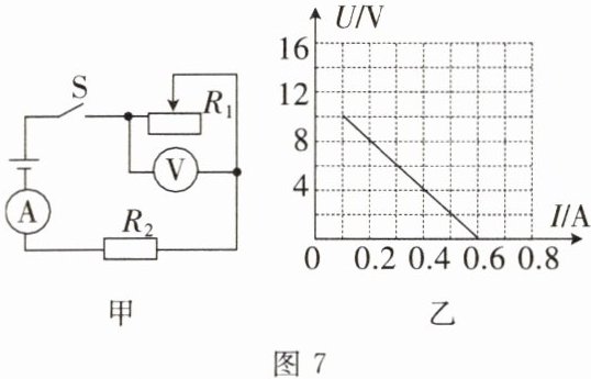 12. (多选)如图7甲所示,电源两端电压不变,$R_{1}$是滑动变阻器,$R_{2}$是定值电阻。当开关S闭合后,逐步改变滑动变阻器接入电路的电阻值,根据电压表与电流表的示数,绘制的图像如图7乙所示。下列判断正确的是(