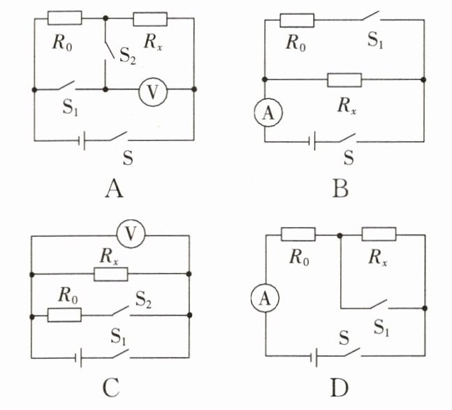 11. 以下四种电路,电源电压不变且未知,$R_{0}$是已知阻值的定值电阻,在不拆改电路的情况下,不能测出未知电阻$R_{x}$阻值的电路是(